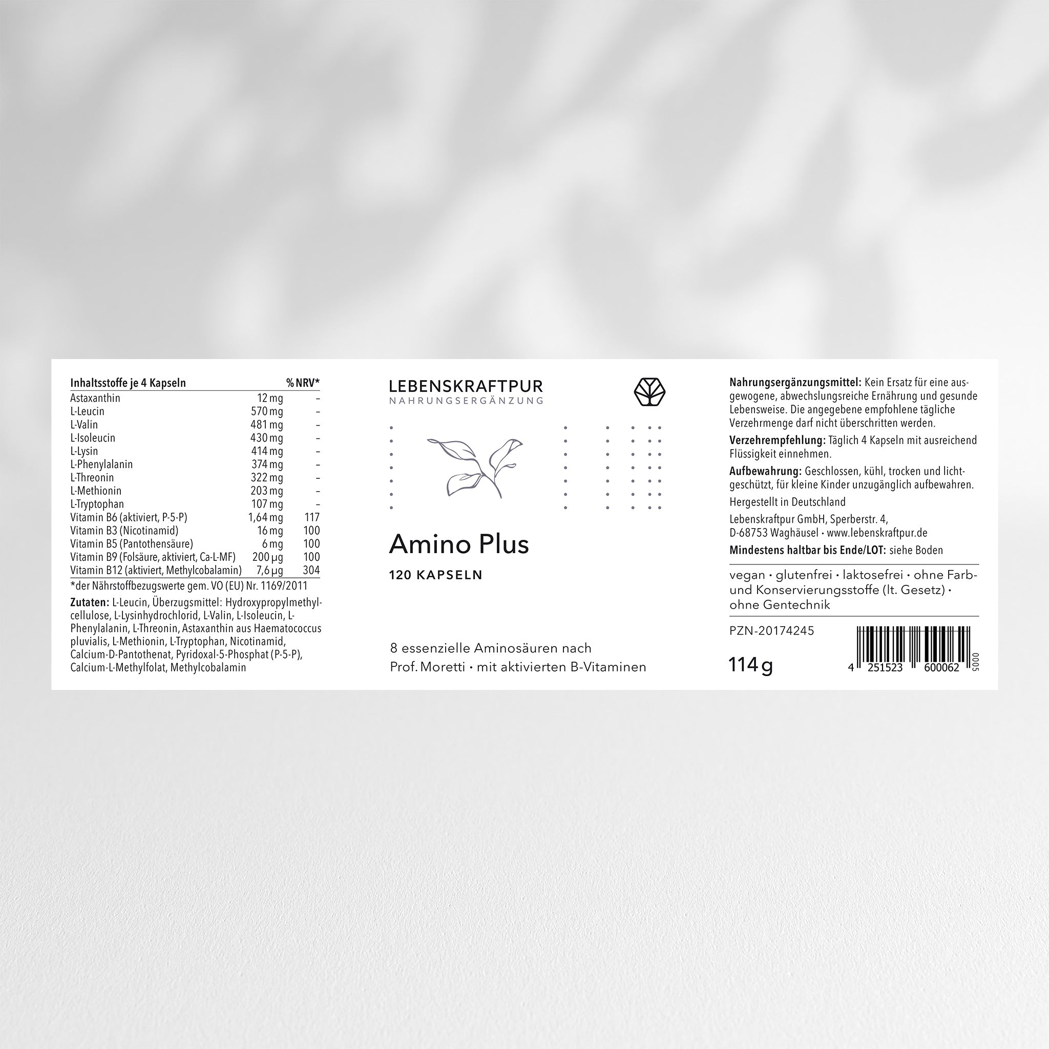 Amino Plus Kapseln sind eine Kombination aus allen 8 essenziellen Aminosäuren mit wichtigen B-Vitaminen in aktivierter Form und dem natürlichen Carotinoid Astaxanthin aus der Blutregenalge.
