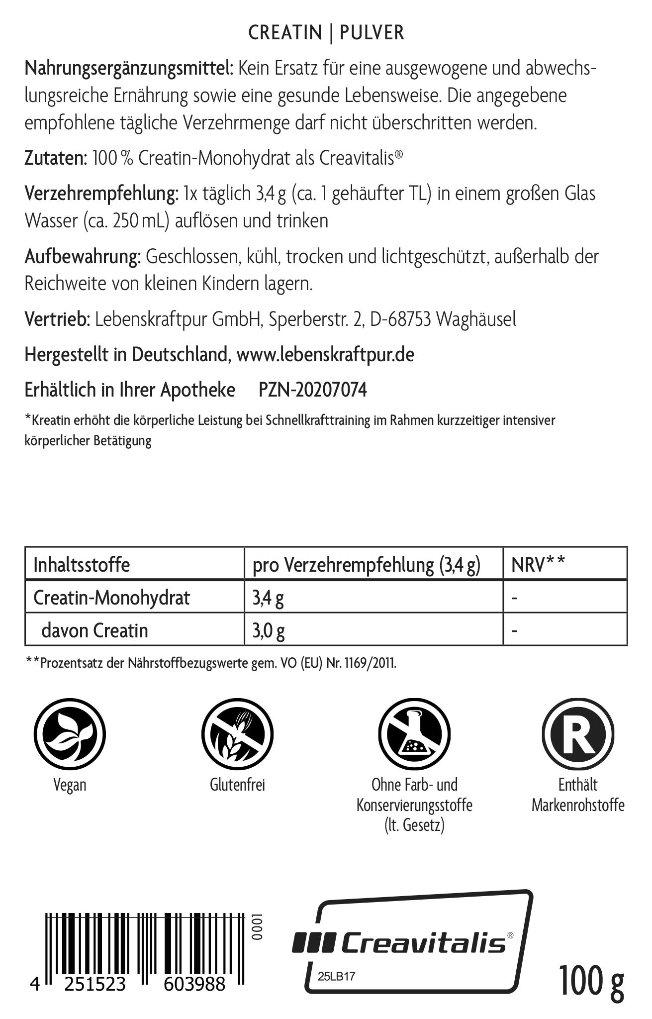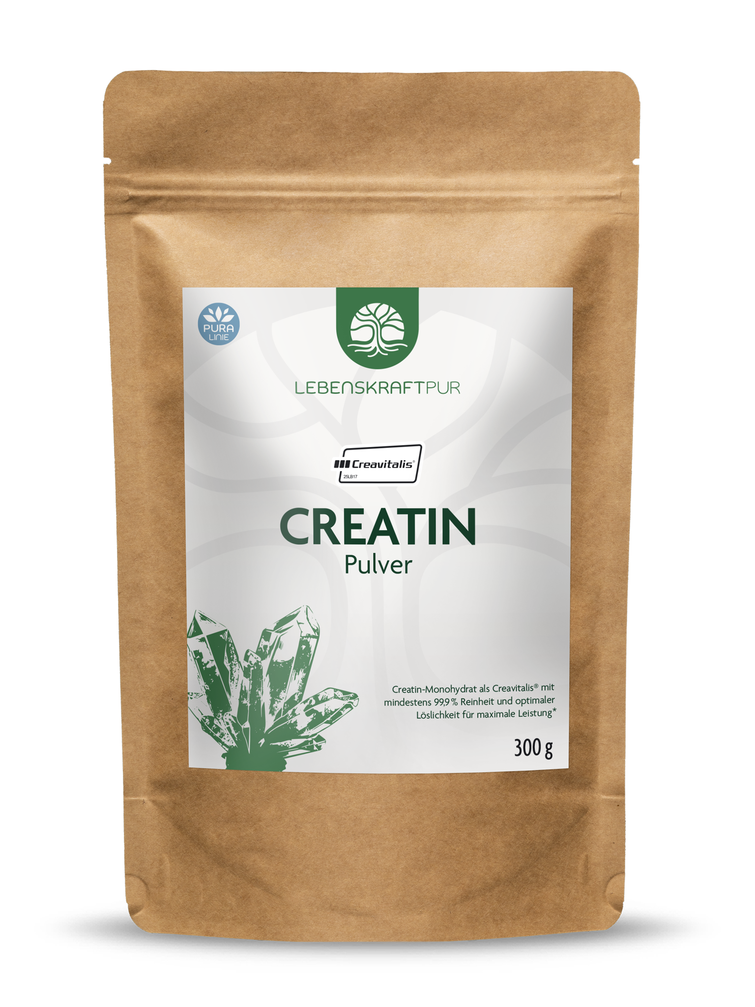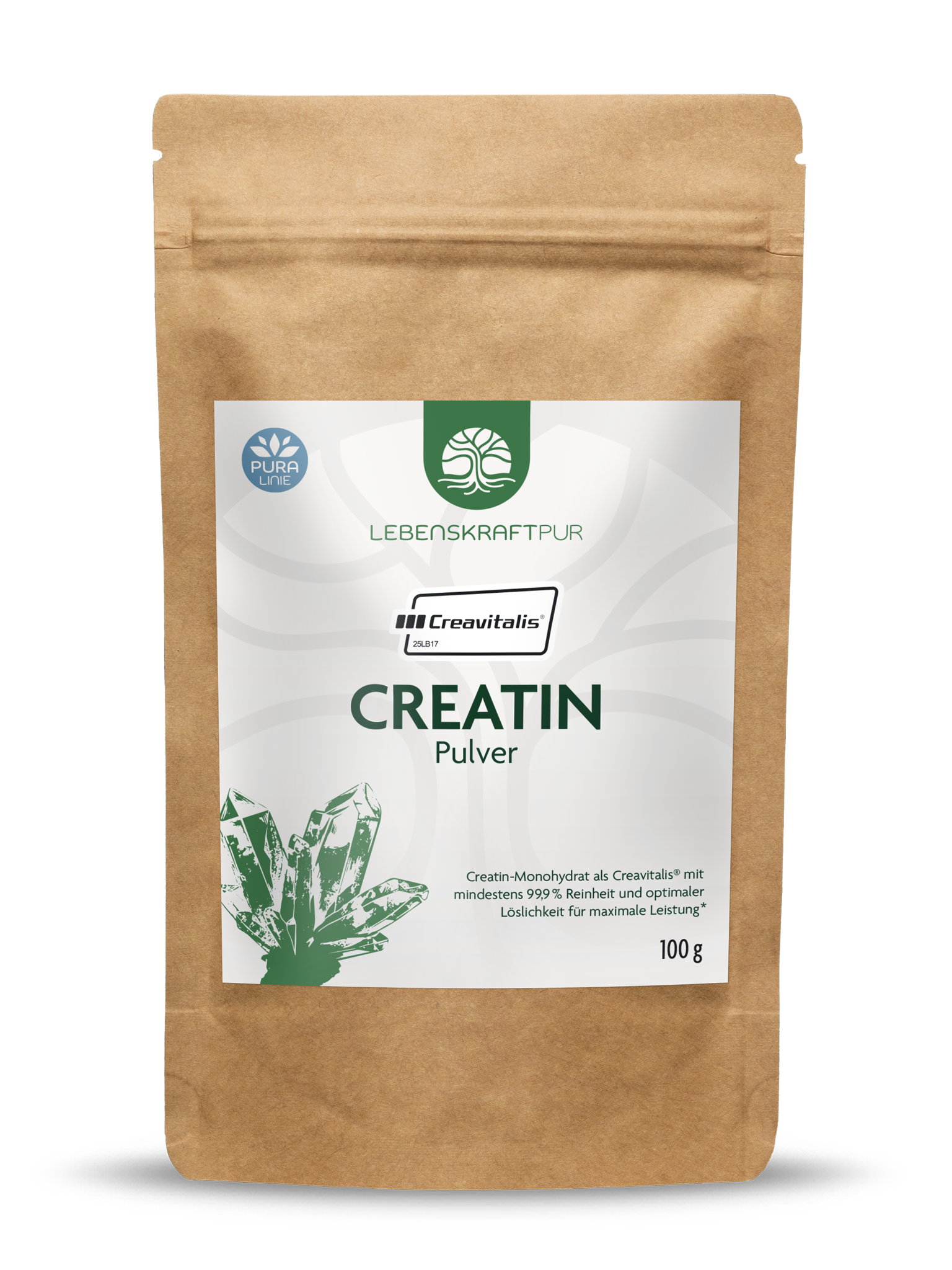 Das Lebenskraftpur Creatin Pulver besteht aus reinem Creatin-Monohydrat als Markenrohstoff Creavitalis® aus Deutschland. Dieser hat eine Reinheit von ≥ 99,9 % und aufgrund der feineren Partikelgröße auch eine bessere Löslichkeit als herkömmliches Creatin-Monohydrat.