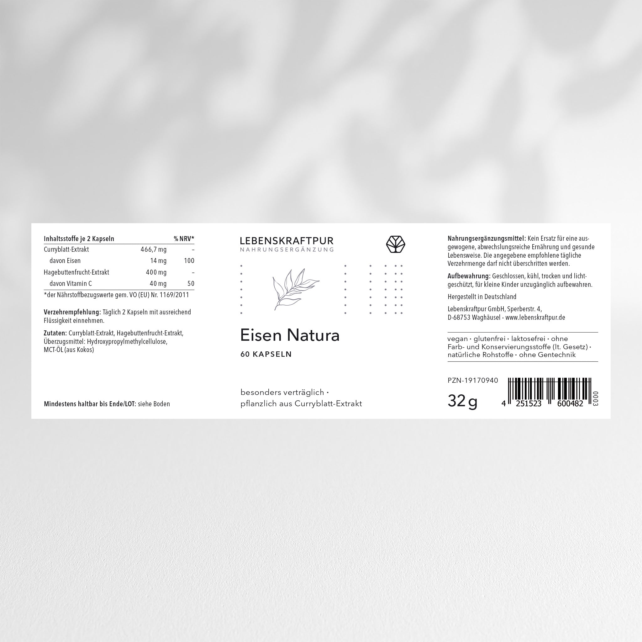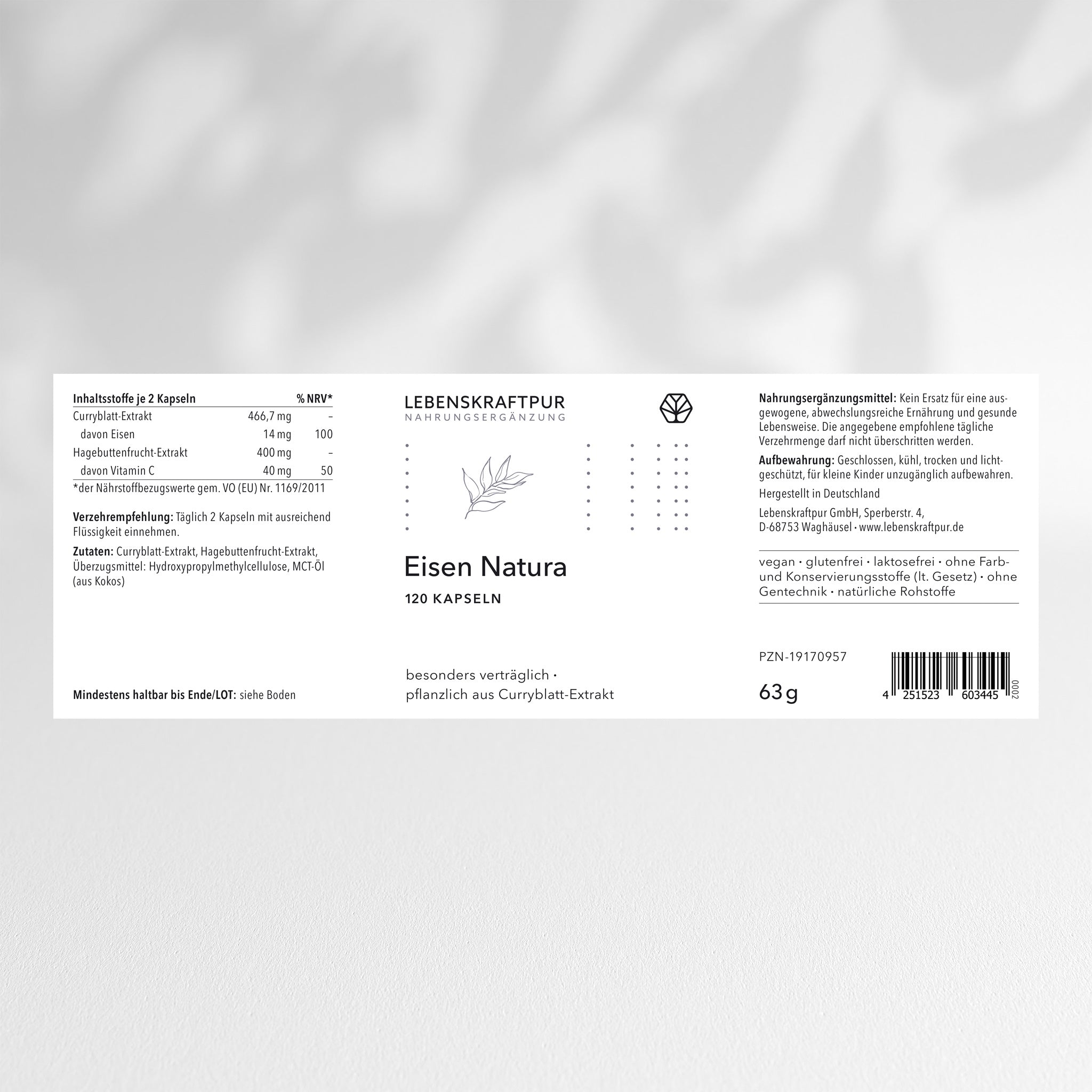 Die Lebenskraftpur Eisen Natura Kapseln sind eine natürliche und rein pflanzliche Alternative zu herkömmlichen Eisenpräparaten. Eisen Natura Kapseln enthalten nur 3 Zutaten: