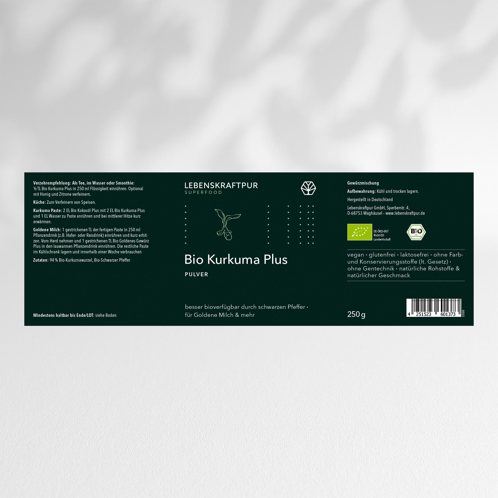 Da wir großen Wert auf höchste Rohstoffqualität legen, stammen die beiden Zutaten von Bio Kurkuma Plus Pulver aus biologischem Anbau und liegen zudem in Rohkostqualität vor. So wird das Kurkuma-Rhizom schonend im Schatten getrocknet und anschießend ohne jegliche Zugabe weiterer Hilfsstoffe pulverisiert.