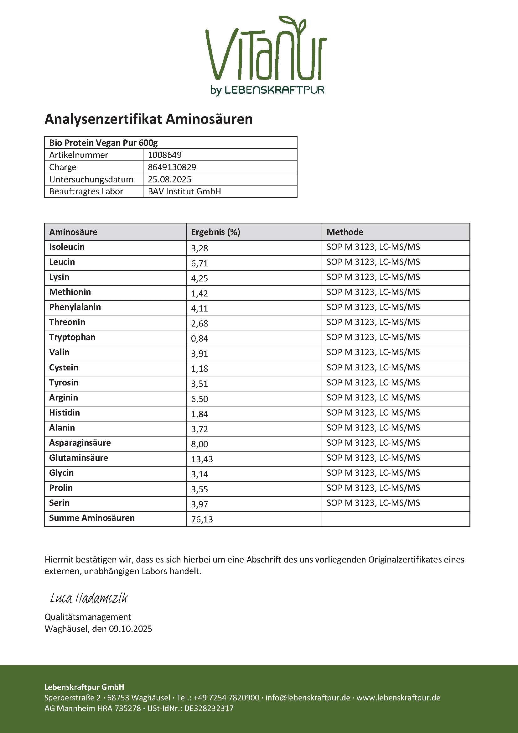 Zudem ist Bio Protein Vegan Pulver reich an verzweigtkettigen Aminosäuren (VKAS/BCAAS) und ist damit für den Muskelaufbau und Erhalt der Muskelmasse hervorragend geeignet.