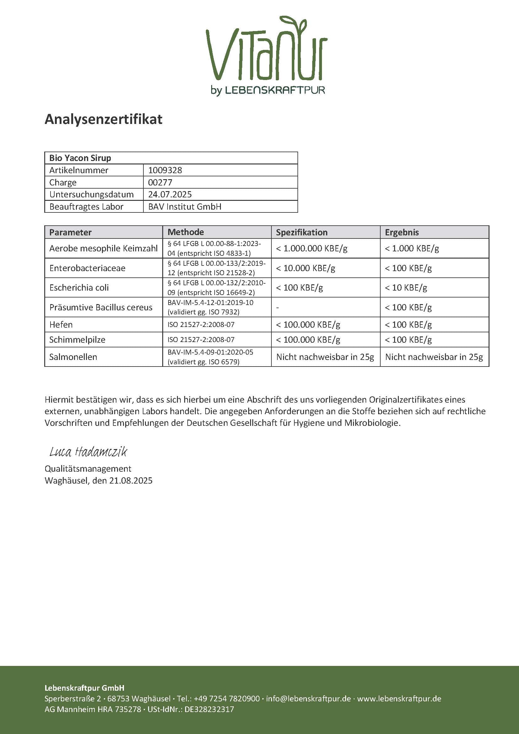 Gemäß des Vitanur Qualitätsanspruchs liegt Bio Yacon Sirup in Bio- sowie Rohkostqualität vor. Vom Anbau über die Ernte der Yacon-Wurzel bis zur Herstellung des süß-aromatischen Sirups kommen dabei ausschließlich schonende Verarbeitungsmethoden und selbstverständlich keinerlei Zusatzstoffe zum Einsatz.